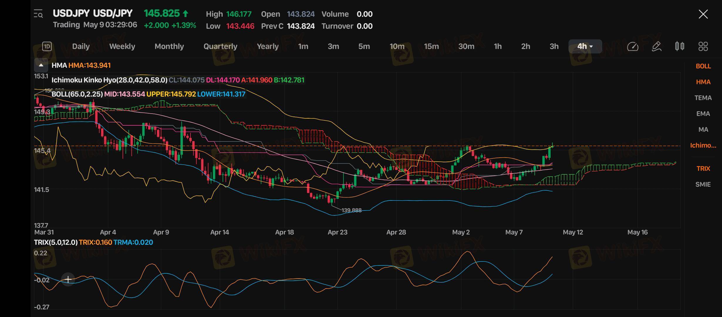 HMA (Hull Moving Average): 143.941 (harga jauh di atas HMA, sinyal bullish kuat)