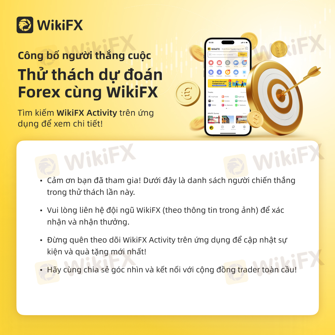 Cảm ơn bạn đã tham gia! Dưới đây là danh sách người chiến thắng trong thử thách lần này.Vui lòng liên hệ đội ngũ WikiFX (theo thông tin trong ảnh) để xác nhận và nhận thưởng.Đừng quên theo dõi WikiFX Activity trên ứng dụng để cập nhật sự kiện và quà tặng mới nhất!Hãy cùng chia sẻ góc nhìn và kết nối với cộng đồng trader toàn cầu!