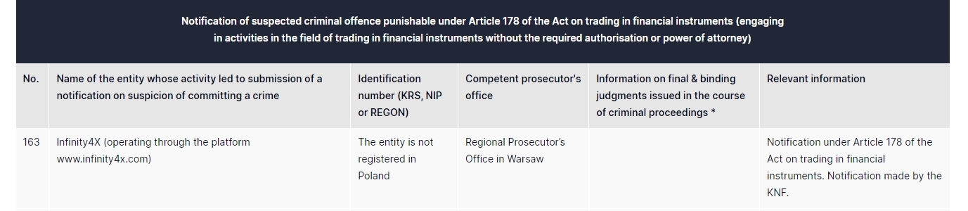 Infinity4x(hoạt động thông qua nền tảng www. Infinity4x .com) tổ chức này không được đăng ký tại văn phòng công tố khu vực Ba Lan theo thông báo Warsaw theo điều 178 của đạo luật kinh doanh công cụ tài chính. thông báo được thực hiện bởi knf.