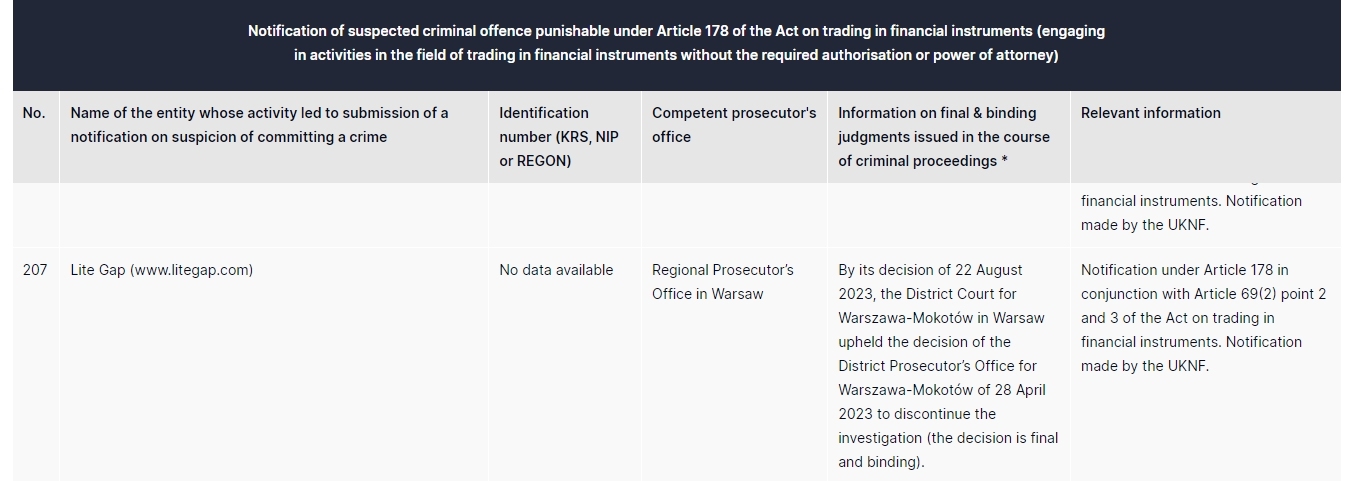 khoảng cách nhỏ (www. LiteGap .com) không có dữ liệu Văn phòng công tố khu vực ở Warsaw theo quyết định ngày 22 tháng 8 năm 2023, tòa án quận của Warszawa-mokotów ở Warsaw đã giữ nguyên quyết định của văn phòng công tố quận đối với Warszawa-mokotów ngày 28 tháng 4 năm 2023 về việc ngừng điều tra (the quyết định là cuối cùng và có tính ràng buộc). thông báo theo điều 178 kết hợp với điều 69(2) điểm 2 và 3 của Luật kinh doanh công cụ tài chính. thông báo được thực hiện bởi uknf.