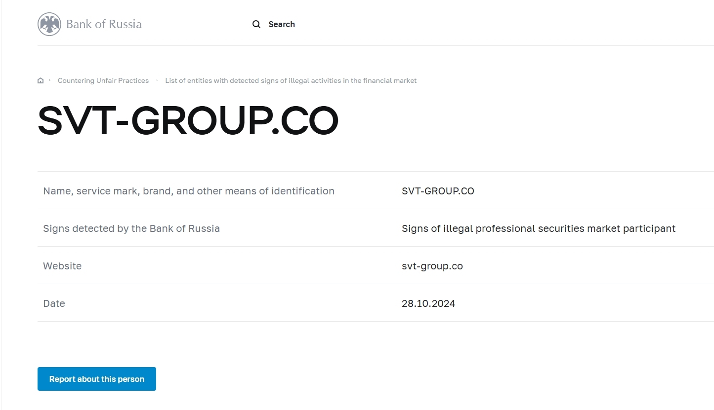 Tên, nhãn hiệu dịch vụ, thương hiệu và các phương tiện nhận dạng khác SVT-GROUP.CO Các dấu hiệu được Ngân hàng Nga phát hiện Các dấu hiệu của người tham gia thị trường chứng khoán chuyên nghiệp bất hợp pháp Trang web svt-group.co Ngày 28.10.2024