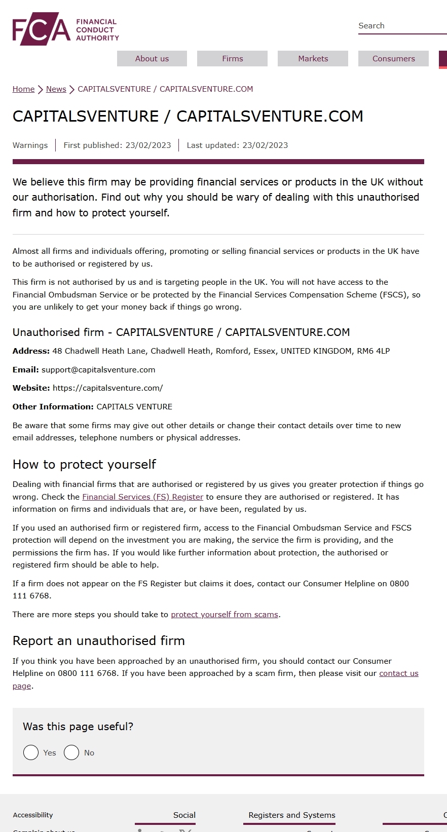 Danh sách cảnh báo FCA về các công ty không được ủy quyền CAPITALSVENTURE / CAPITALSVENTURE.COM.