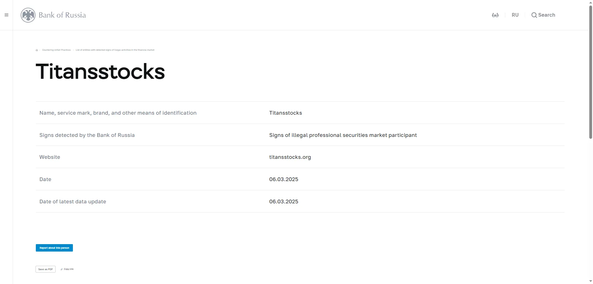 Tên, nhãn hiệu dịch vụ, thương hiệu và các phương tiện nhận dạng khác Titansstocks Các dấu hiệu được Ngân hàng Nga phát hiện Dấu hiệu của người tham gia thị trường chứng khoán chuyên nghiệp bất hợp pháp Trang web titansstocks.org Ngày 06.03.2025 Ngày cập nhật dữ liệu mới nhất 06.03.2025.