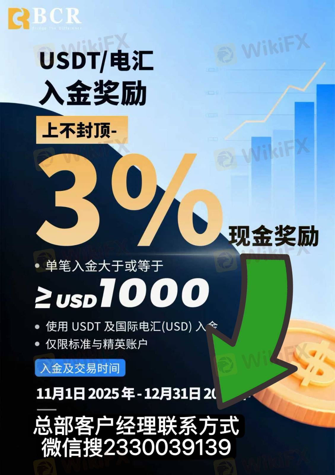本月入金活动已上线: USDT / 电汇 单笔≥1000 USD 即享 3% 现金返还(无上限)