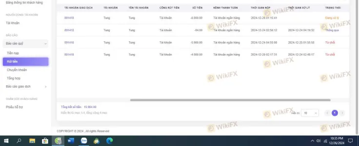 Ngày 25/11/2024, tôi có quen IB sàn IVy Markets tên là Minh Quang (Số điện thoại zalo là 0924.540.640). Người này dụ dỗ tôi nạp tổng cộng 12.000 USD vào sàn dưới tài khoản MT5 891418 để trade và copytrade. Khi thấy dấu hiệu sụt giảm và sàn gian lận, tôi đã làm đề xuất rút thử 84USD. Sàn chấp thuận. Nhưng khi có yêu cầu rút hết thì sàn không phản hồi. Đặc biệt, ngày 27/12/2024, sàn này tự ý thực hiện lệnh rút tiền trong tài khoản của tôi số tiền là 5.000 USD trên tổng số 6.227 USD. Tôi đã đề nghị sàn làm rõ, nhưng không thể liên hệ được với IB hay sp của sàn.