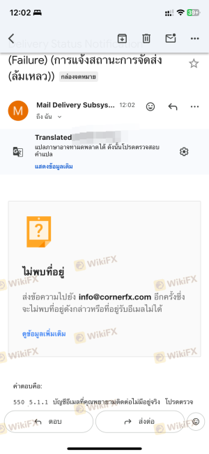 ข้าพเจ้าไม่สามารถติดต่อฝ่ายซัพพอร์ตได้จริง โดยอีเมลที่ระบุอย่างเป็นทางการ info@cornerfx.com มีการตีกลับ (Delivery Failure – 550 5.1.1) และการติดต่อผ่าน LINE พบว่าอ่านแล้วไม่ตอบ ไม่มีการช่วยเหลือใด ๆ นอกจากนี้ ยังพบความผิดปกติด้านเส้นทางการเงิน ประวัติธุรกรรม และข้อมูลการเทรดที่ไม่ชัดเจน ไม่สามารถตรวจสอบย้อนหลังได้ โดยเฉพาะในช่วงที่ราคาทองคำผันผวน และไม่ได้รับคำอธิบายจากโบรกเกอร์ จากเหตุการณ์ดังกล่าว ข้าพเจ้าเห็นว่า CORNER FX ขาดความโปร่งใส ไม่มีช่องทางติดต่อที่ใช้งานได้จริง และส่งผลให้ข้าพเจ้าได้รับความเสียหาย