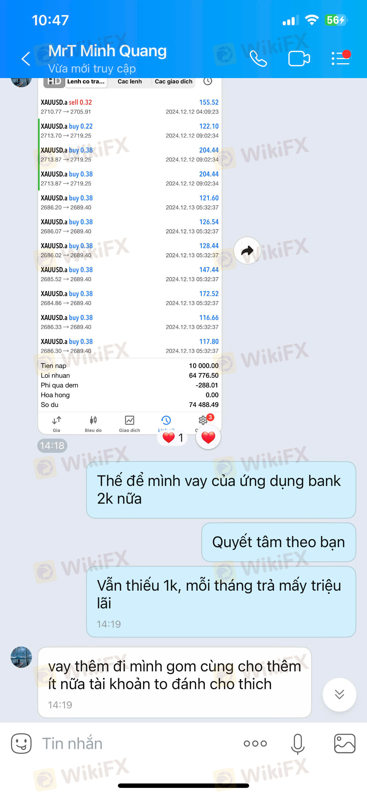 Ngày 25/11/2024, tôi có quen IB sàn IVy Markets tên là Minh Quang (Số điện thoại zalo là 0924.540.640). Người này dụ dỗ tôi nạp tổng cộng 12.000 USD vào sàn dưới tài khoản MT5 891418 để trade và copytrade. Khi thấy dấu hiệu sụt giảm và sàn gian lận, tôi đã làm đề xuất rút thử 84USD. Sàn chấp thuận. Nhưng khi có yêu cầu rút hết thì sàn không phản hồi. Đặc biệt, ngày 27/12/2024, sàn này tự ý thực hiện lệnh rút tiền trong tài khoản của tôi số tiền là 5.000 USD trên tổng số 6.227 USD. Tôi đã đề nghị sàn làm rõ, nhưng không thể liên hệ được với IB hay sp của sàn.