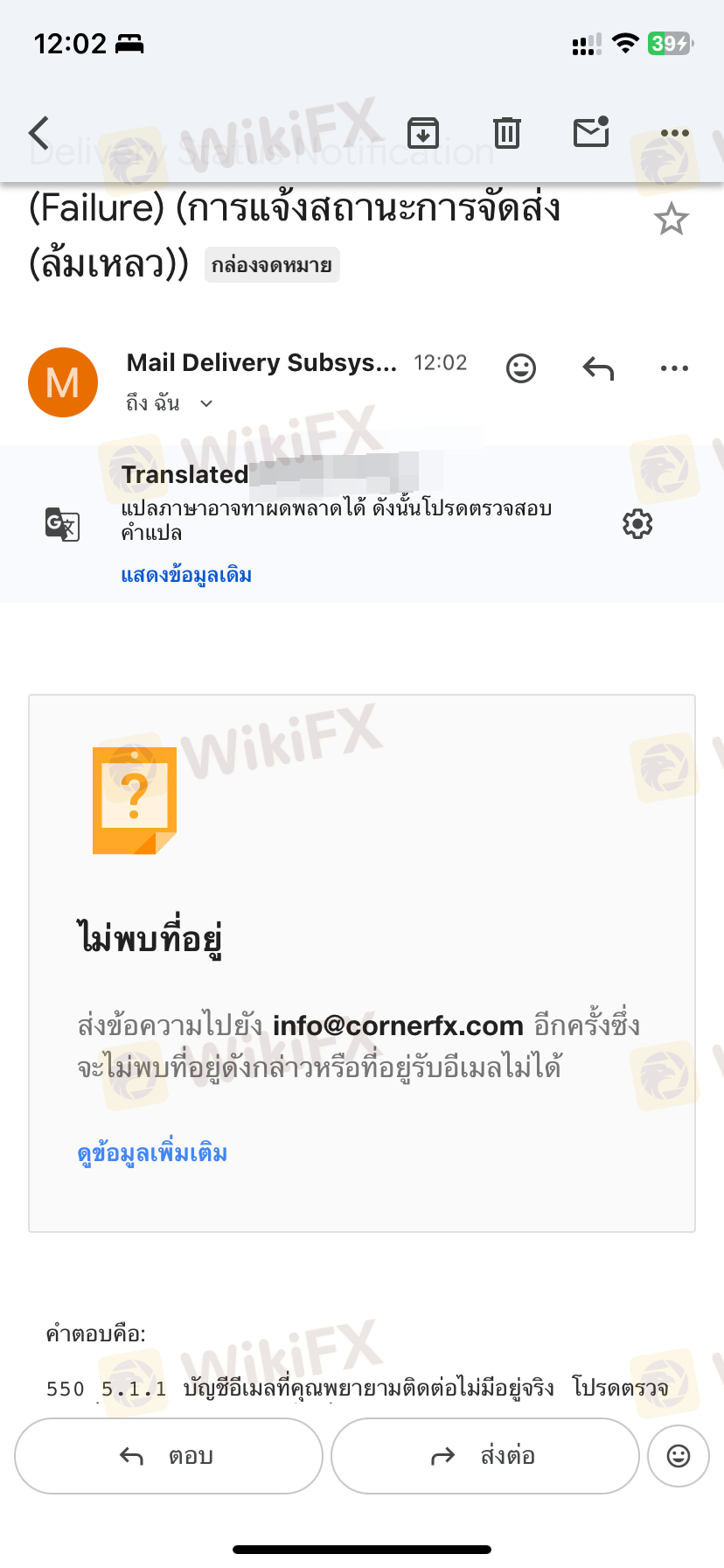 info@cornerfx.com มีการตีกลับ (Delivery Failure – 550 5.1.1) และการติดต่อผ่าน LINE พบว่าอ่านแล้วไม่ตอบ ไม่มีการช่วยเหลือใด ๆ