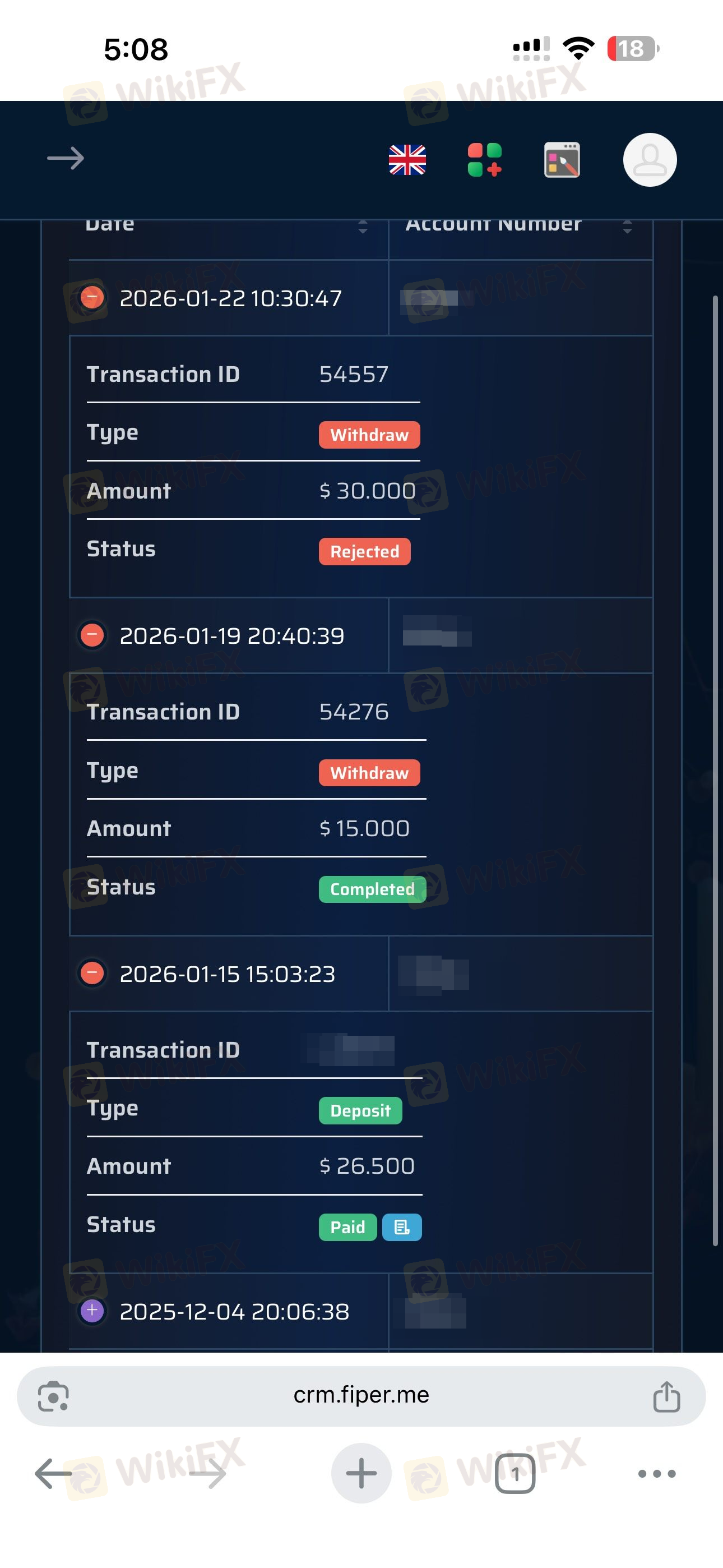 首次存款金额必须为$250 或以上。Fiper接受Visa、MasterCard、以太eum、银行转账、比特币和Perfect Money进行存款和取款。转账处理时间为1至5个工作日。然而,相关手续费未知。