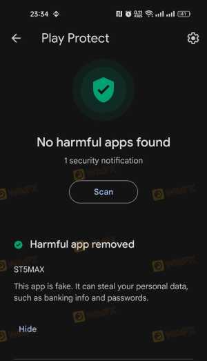 我被一个中国女孩骗了3750美元投资ST5应用。一开始她替我做交易,总是要求我存入更多美元以增加利润。 她向我展示了如何提取 100 美元,并收到了 80.00 美元,向我展示一切都很好。在我拥有 3750 美元的资金后,我尝试提取,但他们要求我支付资金的 20%,以允许我提取资金。 后来我收到谷歌发来的一条消息,称他们从我的手机中删除了 ST5MAX 应用程序,因为它是一个假应用程序,可能会窃取我的个人信息,例如银行帐户和密码。