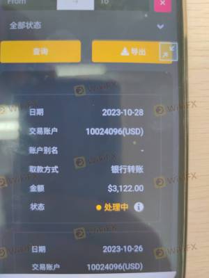 账号:10006231 2023.10.26号出金金额:40000美金(未扣款) 2023.10.30号出金金额:46940美金(未扣款) 今天是11月13号仍然没有扣款,联系在线客服,说通道问题,从1号开始就说一周处理,到现在又说还需要一周到两周,一直再拖时间。