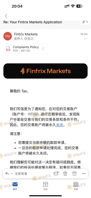 大家千万避雷 Fintrix Markets(母公司 Aksys Global Markets Ltd),这是一个典型的输打赢要的诈骗对赌盘! 我在该平台参与了他们授权的 跟单交易(Copy Trading) 。我本人并没有进行任何实际的手动或程序化操作,完全是跟随带单员的信号。 运气好,跟单赚了 1078 美金的利润。当我要申请出金时,平台直接撕破脸!他们先是在后台发了一张日结单,通过一笔名为 “PnL Correction”(盈亏修正) 的操作,直接把我账户里的 1078 美金利润全部扣除(见图2红框)。 当我发邮件质问时,他们竟然回复了一封极其荒谬的邮件(见图1), 诬陷我使用了“高频自动策略(high-frequency automated strategies)”和“双向快速开平仓”! 这简直是滑天下之大稽!我是一个纯粹的跟单者,用的是你们平台允许的带单员! - 如果带单员爆仓亏了我的本金,你们会以“违规执行”退钱给我吗?绝对不会! - 现在带单员赚了钱,你们就说带单员违规,然后把我们这些无辜跟单散户的利润全部没收! 这说明 Fintrix Markets 根本没有任何真实市场抛单,完全是对赌盘。客户赚钱了,他们就急眼拔网线、找技术借口抢钱! 在线客服全程装死拖延,邮件回复各种敷衍。希望天眼官方介入,也提醒所有交易者:远离 Fintrix Markets,这是一家只能亏钱、不能赚钱的纯黑平台!不退回我的 1078 美金,我会一直维权到底!