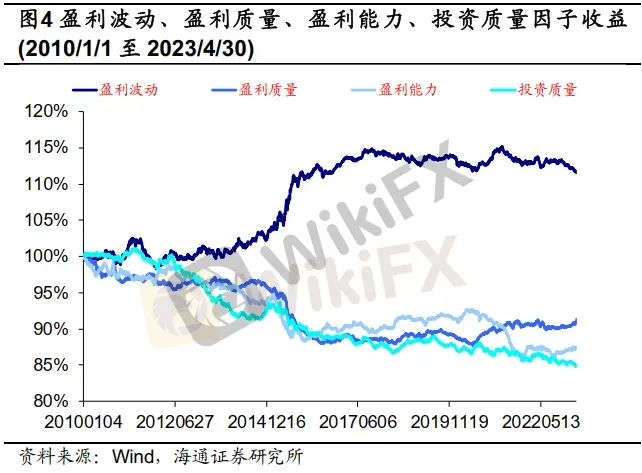 投资质量因子由总资产增长率、流通股本增长率和资本支出增长率这几个要素构成,实际上直接反映的是公司投资的增长率。而若公司投资的增长率在加快,则其投资的质量可能会有所下降,因此这几项指标在构造投资质量因子时做了负向处理。不过自2010年以来,投资质量因子的累计收益曲线持续下行,表明在A股市场中,投资扩张速度快的公司股价表现会相对更好。但值得注意的是,2018年以来投资质量因子累计收益曲线向下的斜率明显减小,说明市场对于资本快速扩张的公司给的溢价正在减少。