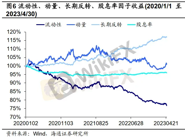 2020年至2023年4月末期间,在长期反转因子上风格收益最高的前5只基金分别为肖觅管理的嘉实物流产业、杨鑫鑫管理的工银瑞信创新动力、王平管理的招商量化精选、杜洋管理的工银瑞信战略转型主题以及林英睿管理的广发多策略。我们认为这五位基金经理均是偏好左侧逆向布局低估值个股的基金经理,因此他们在长期反转因子上获得了较高的收益。