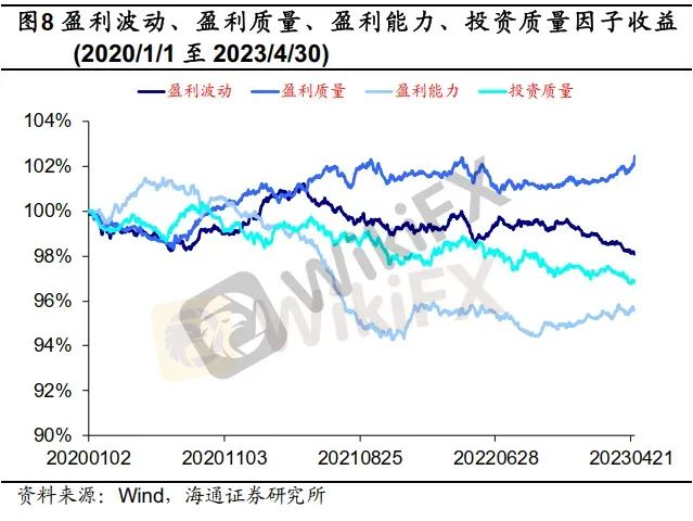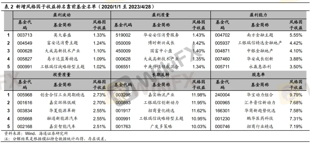 从产品来看,在盈利能力因子上暴露较高的基金,往往是一些持仓主要为消费、医药板块龙头个股的主题基金。2020年至2023年4月末期间,在盈利能力因子上获得风格收益最高的5只基金分别为黄春逢管理的南方金融主题、鄢耀管理的工银瑞信精选金融地产、刘腾管理的中银金融地产、胡宜斌管理的华安成长创新以及李永兴管理的永赢惠添利。由于2021年以来盈利能力因子的表现不佳,因这些基金在盈利能力因子上实际为负向暴露。这5只基金中,除华安成长创新外均大比例地持有了盈利指标相对较低的金融地产个股,而华安成长创新则是由于基金经理左侧布局了一些基本面在底部的个股,因此持股的盈利能力指标较低。