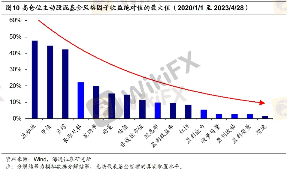 公募基金在不同因子上所能获得的超额收益本身是存在差异的,下图给出了主动股混基金样本在各因子上所获得的收益贡献的绝对值的最大值。从结果来看,流动性、市值和贝塔因子的最大收益明显高于其他因子。值得注意的是,主动股混基金在估值因子上其实是能获得较高的超额收益的,只是高估值和低估值基金在估值因子上的风格收益基本相抵,因此估值因子的平均收益贡献基本为零。而新版因子当中新增的盈利能力、投资质量、盈利质量、盈利波动等因子则是因子本身的收益贡献就相对较少。