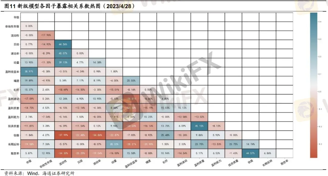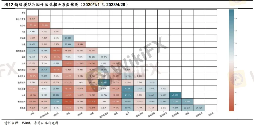 下图给出了2020年以来新版模型中各因子日收益间的相关系数情况,可以看到,投资质量因子与杠杆因子、估值因子之间,盈利因子与盈利质量因子之间,长期动量反转因子和流动性因子之间,有较为明显的正向相关关系。而动量因子与长期反转因子、盈利质量因子之间,长期反转因子与贝塔因子之间,则有较为明显的负向相关关系。