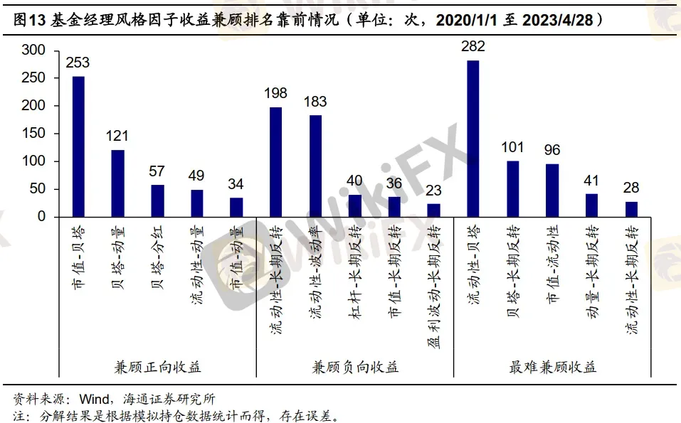 而从最难兼顾收益的结果来看,流动性因子和贝塔因子是最多基金经理难以兼顾的因子组合,大多数基金经理会选择获得贝塔因子的正收益,而在流动性因子上获得负收益。这也一定程度上解释了为什么流动性因子收益长期为负,但很少基金经理会在该因子上进行负向暴露。因为交易活跃的个股其市场的Beta属性往往也会比较强,因此基金经理要获得贝塔因子的收益,就不可避免的在流动性因子获得一定的负收益。此外,贝塔因子和长期反转因子,以及市值因子和流动性因子,同样是基金经理较难兼顾的因子组合。
