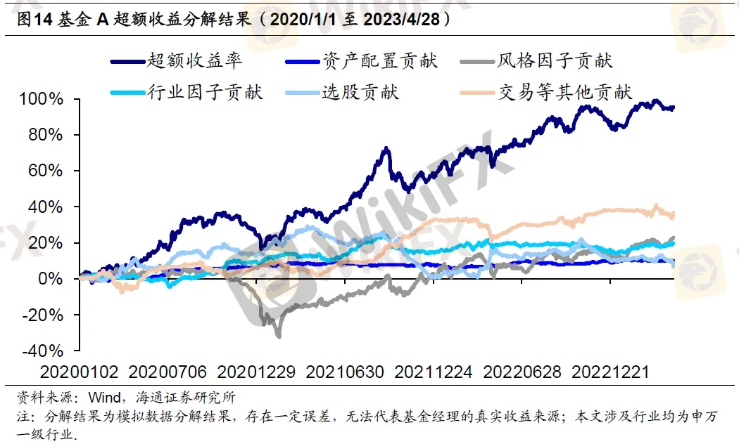 从基金A的超额收益分解结果来看,交易等其他贡献是基金A超额收益的主要来源,而行业因子和风格因子同样也为基金带来了一定的超额收益。基金A自2020年以来的超额收益整体稳步上升,在2020年底有一定回撤,这段超额收益的波动主要来自于当时风格因子的负向贡献。2021年以来,基金A在风格因子上持续获得超额收益,而基金A在行业因子上的超额收益主要来自于2021年9月之前。