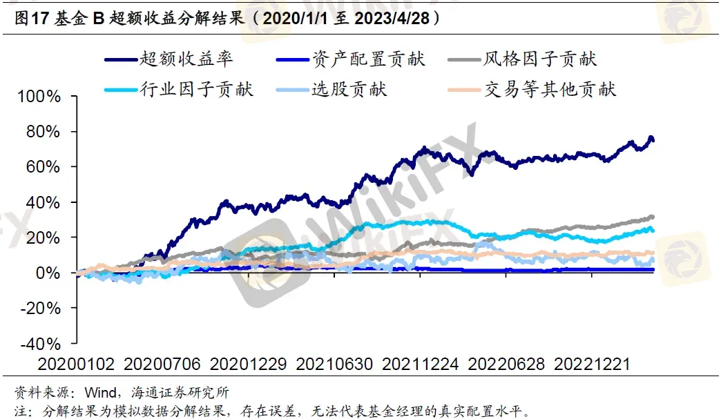 从收益分解的角度来看,风格因子是基金B最主要的超额收益来源,全区间风格因子共贡献了31.83%的超额收益,并且风格因子收益贡献的走势较为稳定,基本没有明显的回调。除了风格因子外,行业因子和选股同样也为基金贡献了一定超额收益。2022年之前,行业因子贡献的超额收益相对较高,但在2022年行业因子贡献出现回调,这也是基金B在这一时间段内整体超额收益走平的主要原因。同时,该基金选股超额收益的波动较大,考察期内基金超额收益的波动大部分与选股超额收益的波动有关,但其选股超额收益自2020年下半年以来持续上行。