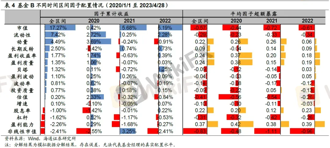 从各风格因子的超额收益来看,市值和流动性因子是基金B最主要的超额收益来源,全区间分别获得了17.27%和7.42%的超额收益。该基金长期低配市值和流动性因子,即持有的个股市值较小,同时换手率较低。
