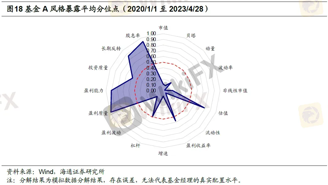 从下图中可以看到,基金A在市值、增速上的排名分位点非常低,而在估值、盈利质量和长期反转因子上排名分位点非常高,表明相比于其他基金,基金A持仓的小市值、低估值、低增速、高盈利质量特征较为显著,并且所选个股多为具备长期反转机会的标的。