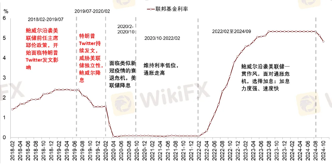 货币政策方面,特朗普的贸易和财政政策加剧通胀再次上行的风险,可能限制美联储降息的幅度。但同时,特朗普也可能实质性削弱美联储的独立性。因为,特朗普扩大美国经济的政治诉求,很大程度上依赖持续的财政扩张,而在近期财政融资成本不断上行的情况下,这一过程更加需要比实际经济增长和通胀水平更为鸽派的货币政策配合,恐进一步加剧通胀压力。鲍威尔的第二任期将持续至 2026 年初,而特朗普已于今年初表态,上任后将不再提名鲍威尔为下一任美联储主席。