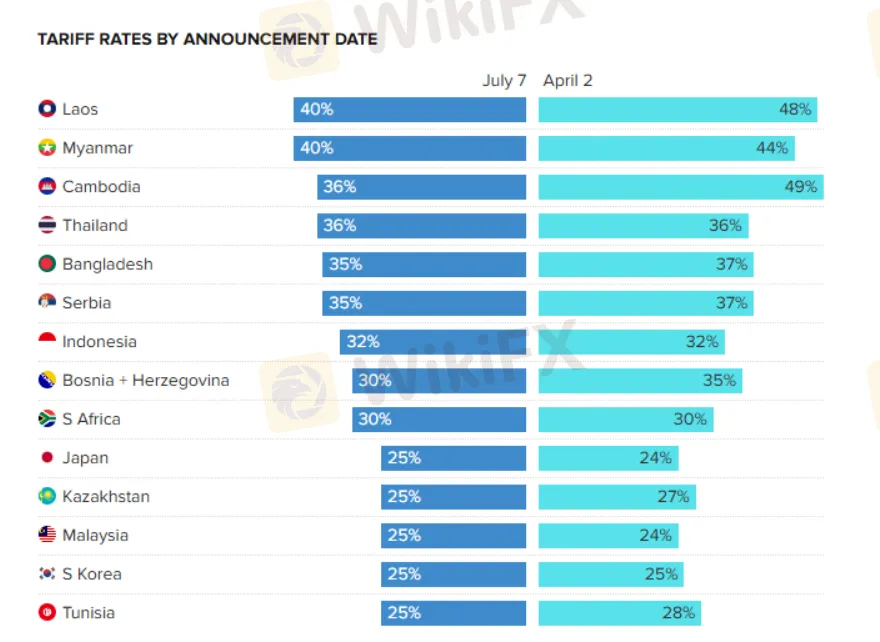 不过,相较于今年 4 月“解放日”公布的关税,相关国家的税率有所下调。比如柬埔寨关税由 49% 降至 36%,泰国维持 36%,孟加拉和塞尔维亚由 37% 降至 35%,波黑由 35% 降至 30%,日本及马来西亚关税小幅上调至 25%。
