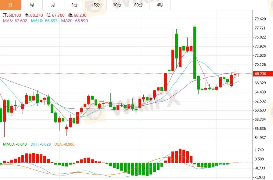 从技术形态看,WTI原油当前运行于20日与50日均线之间,短期呈现震荡上行结构。价格在66.80美元附近形成支撑区域,多头在68美元上方维持控盘地位。