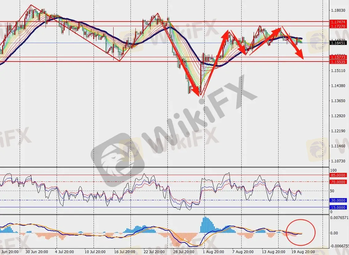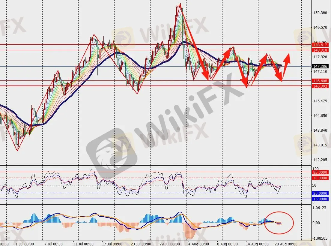 技术面: 欧元兑美元H4级别震荡回落,并在48日多空分界线下方运行。另一方面,MACD双线与量能柱在零轴附近收敛。尽管欧元区通胀没有出现缓解迹象,欧洲央行仍可能在9月再次降息。