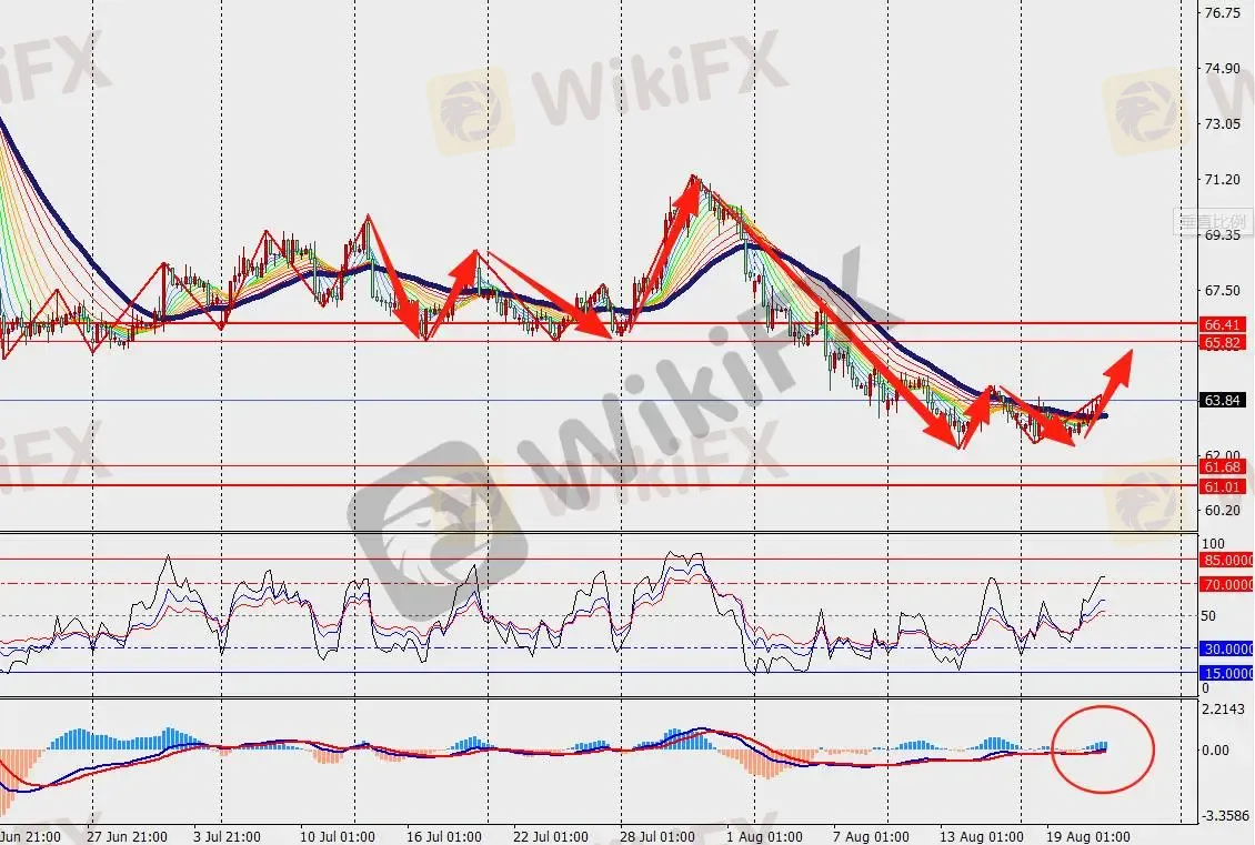 技术面:原油H4级别低位反弹,并回到48日多空分界线上方。此外,MACD双线和量能柱在零轴附近扩张。鉴于美国原油库存下降,且乌克兰外交谈判暂无即时突破,当前基本面基调仍对油价构成谨慎支撑。