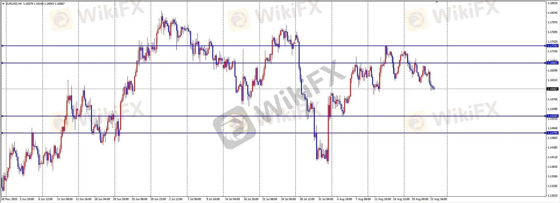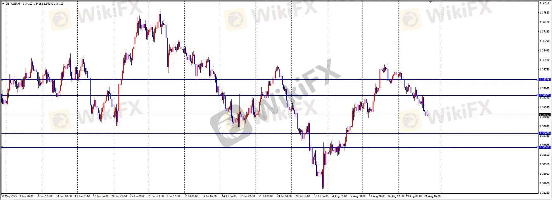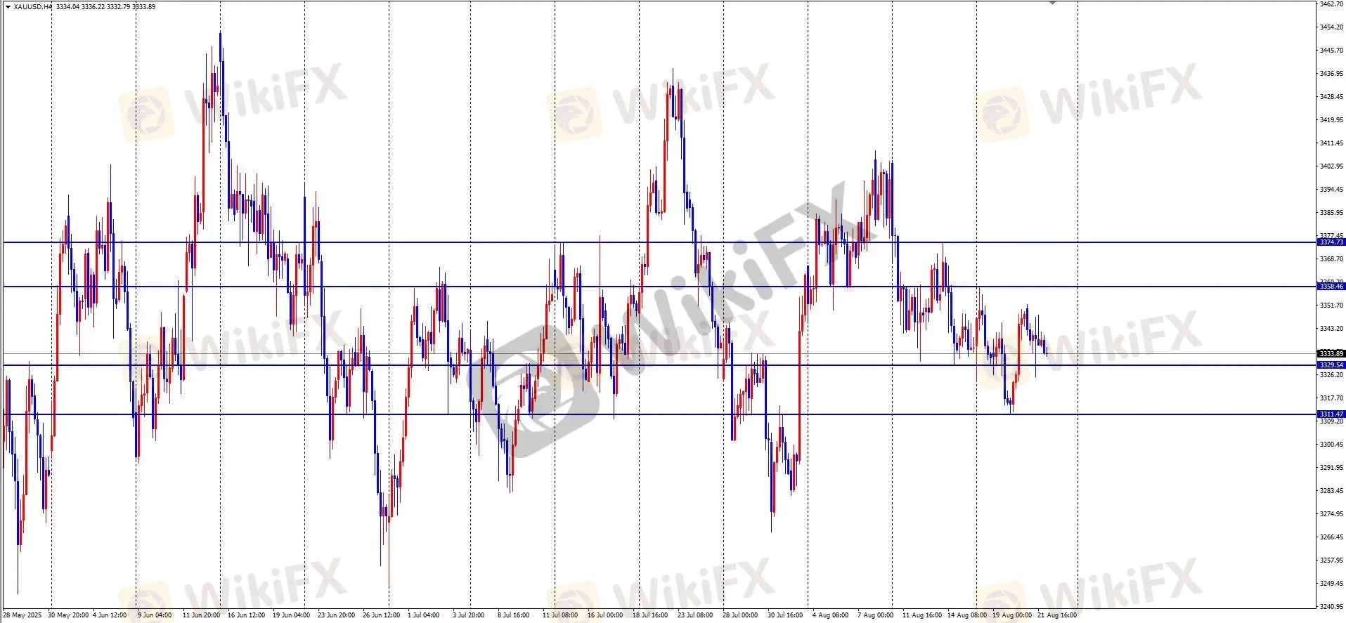 周四黄金行情,亚盘在周三高位回调下跌至 H1 趋势线附近后震荡整理,日线收下影线偏长阳线,全天走出 265 点左右行情,今日有进一步上涨可能。局势上,俄罗斯外长拉夫罗夫 8 月 21 日称普京总统与泽连斯基会谈有两个前提,引发全球关注;美联储官员“打压”降息预期,今晚鲍威尔讲话备受瞩目。从 4 小时周期看,行情震荡下行,在 8 月 20 日上涨以来的黄金分割 50 位置附近,关注 50 和 61.8 位置支撑。
