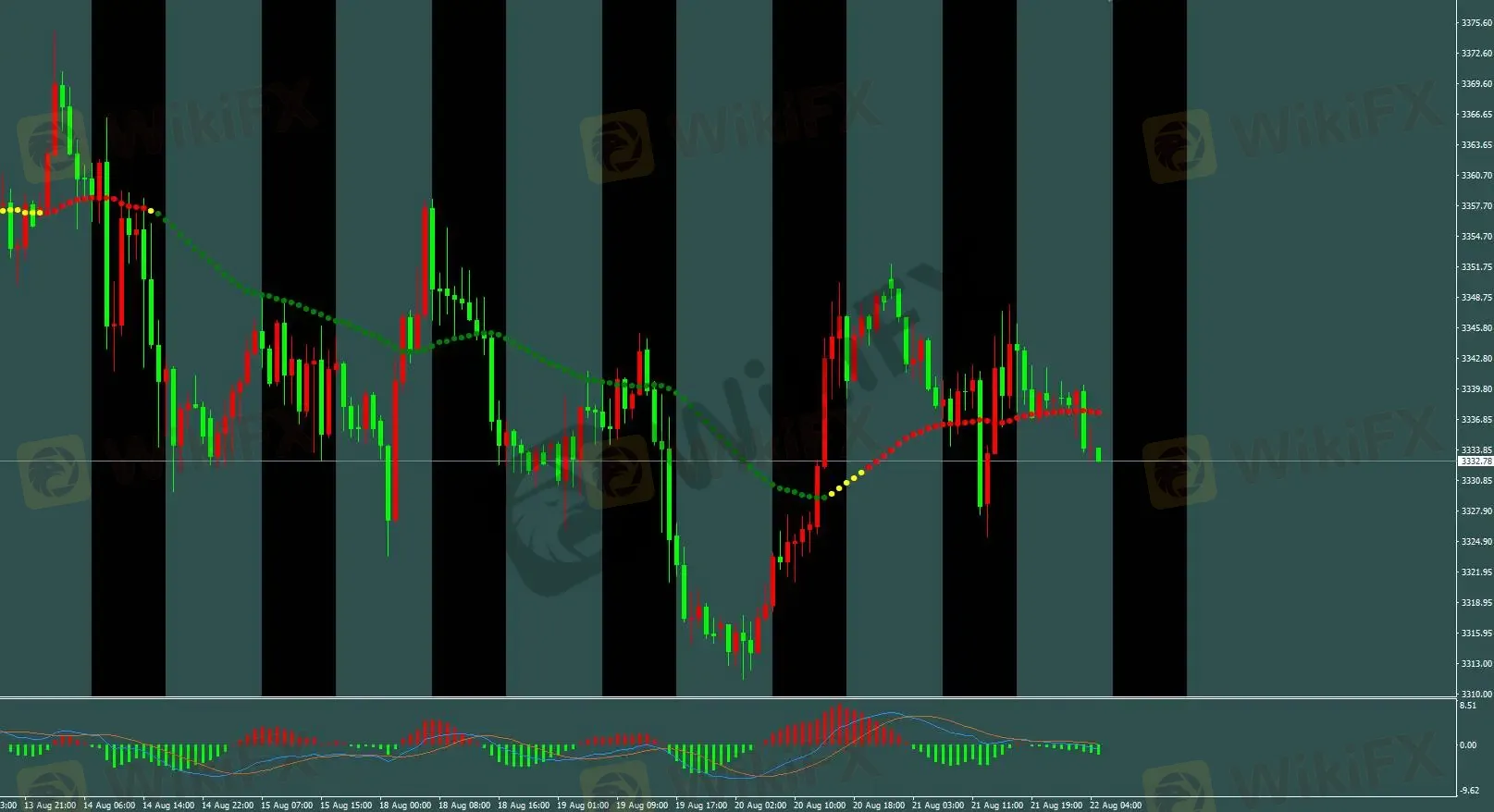 目前三色线颜色维持红色,H1 标准多单在 3337 附近已入场并盈利 100 点出场。今日日内建议根据 M5 基础运用模型进行操作。