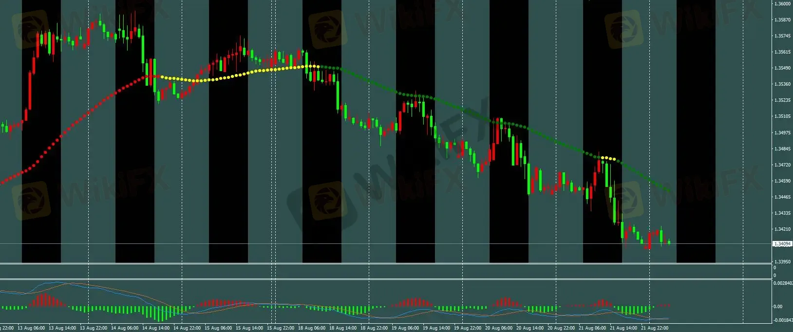 镑美 H1 趋势线颜色目前维持绿色,按照 H1 的交易模型在价格 1.3547 附近入场空单已达成盈利目标。今天可参考 M5 综合运用模型做日内短线交易。