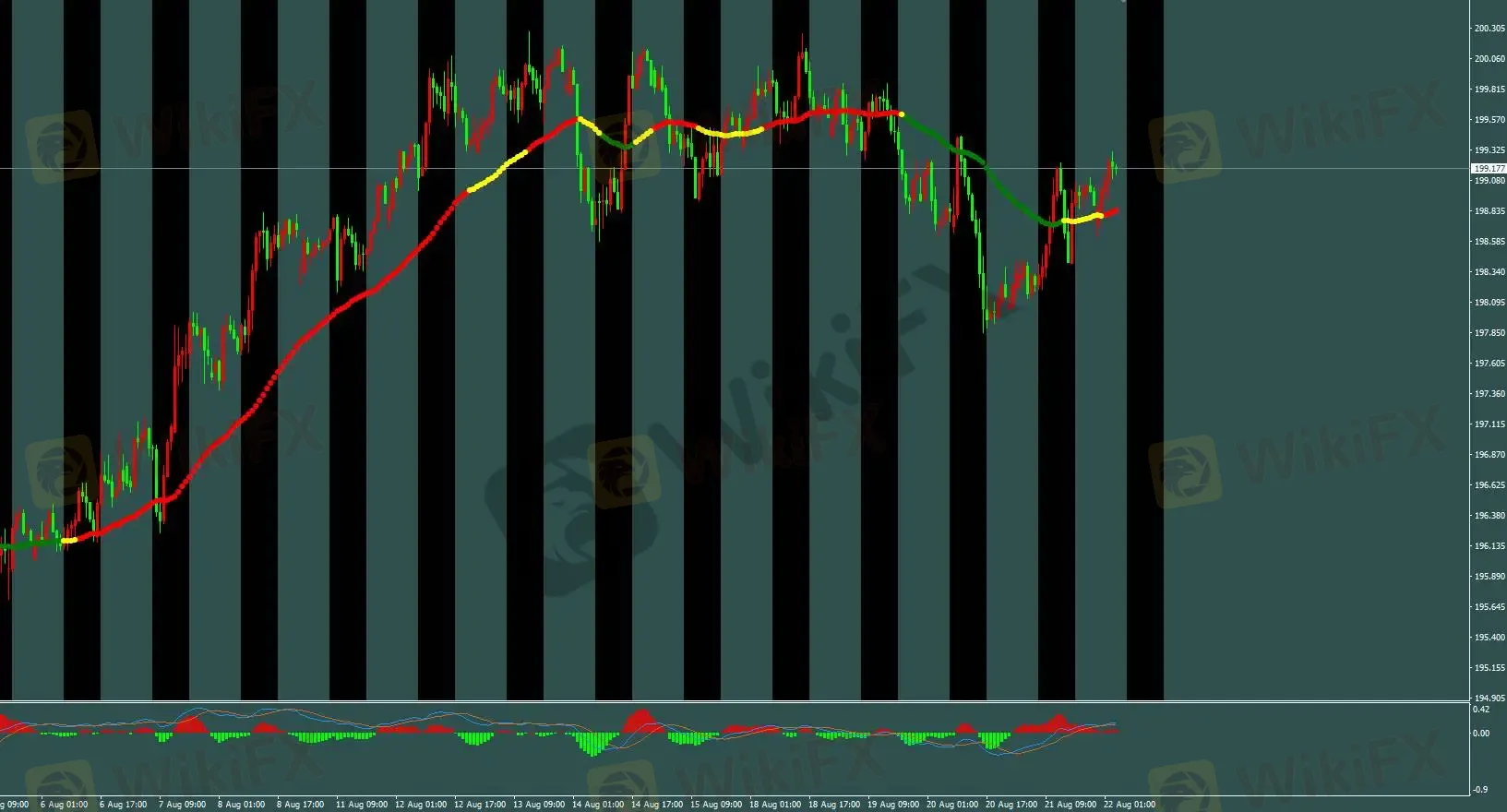 目前三色线颜色维持绿色,H1 标准多单在 198.9 附近已入场,止盈 70 点左右,保护性止损开仓位下方 120 点,或三色线变绿即平仓。今日日内建议根据 M5 基础运用模型进行操作。
