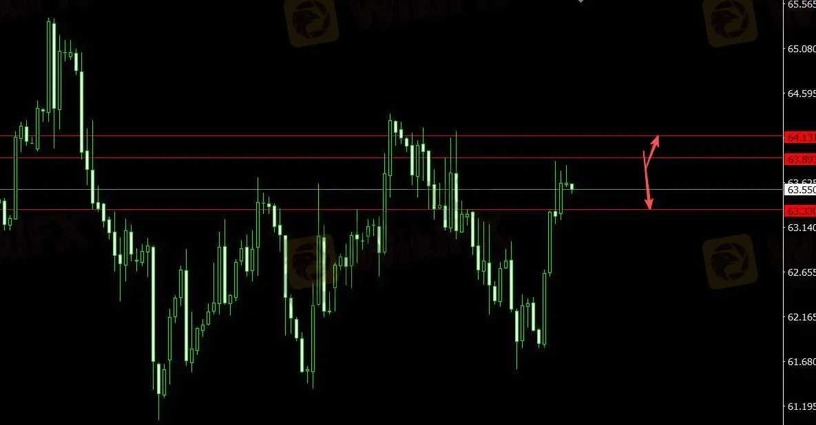 美元指数受支撑,原油承压,关注支撑位63.330,4小时看多至64.130;关注压力位63.890,4小时看空至63.160。