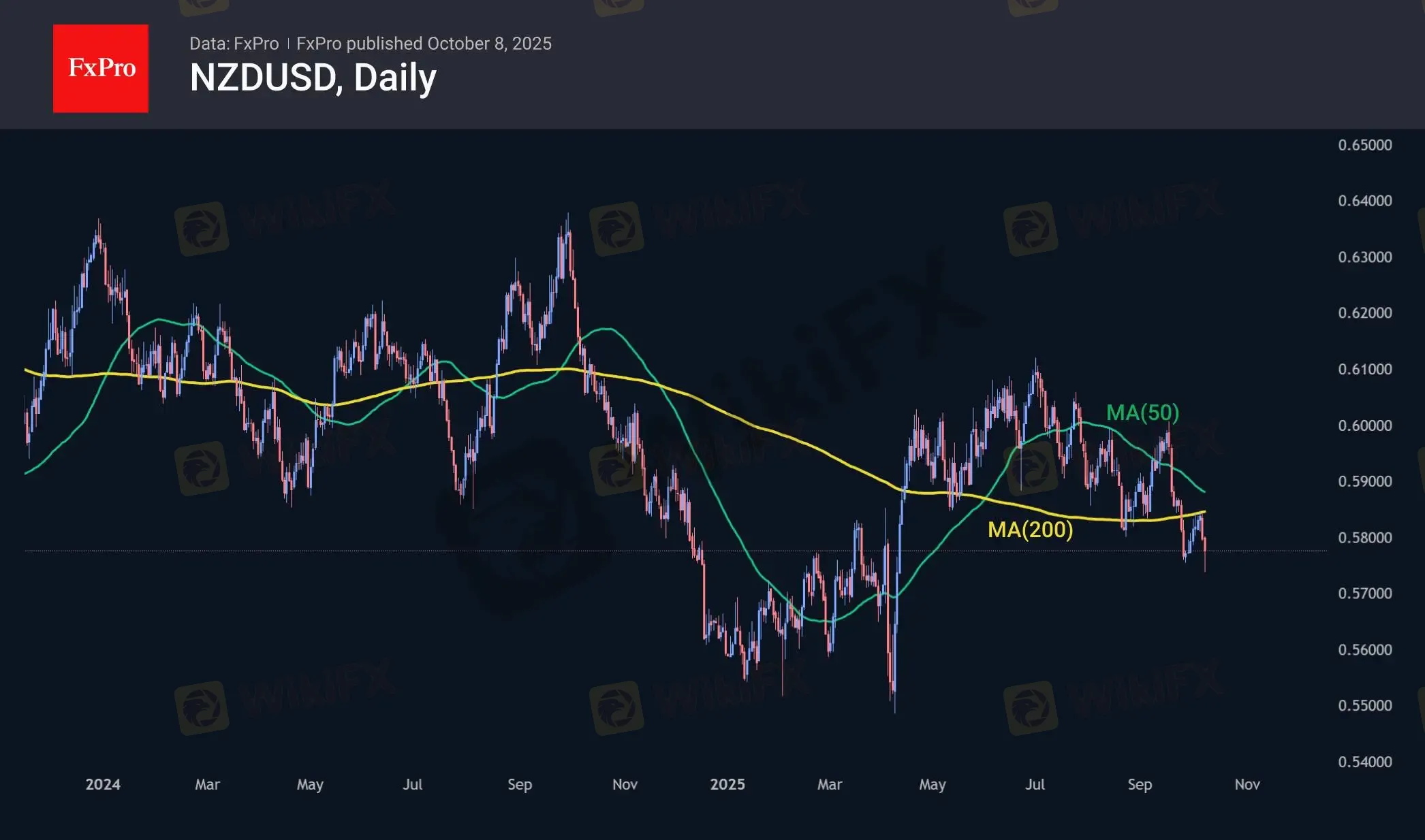 最新消息是新西兰储备银行(RBNZ)意外降息25个基点,决策公布后纽元兑美元(NZDUSD)汇率立即下跌约1%。尽管该货币对目前已反弹约一半的初始跌幅,但仍触及六个月低点0.5730。技术面上,该货币对正形成“死亡交叉”——这是一种看跌信号,即50日均线下穿200日均线。这一信号因两条均线均位于当前价格上方而得到强化,通常预示后续将出现更猛烈的抛售。不过,即使没有这一信号,NZDUSD自7月初以来便持续在下行趋势波动,且在两周前及今日均触及更低的区间。