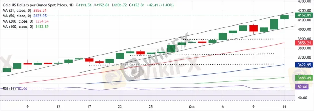 摘要:黄金不断刷新纪录高点,突破 $4,100 美元门槛;焦点转向鲍威尔的讲话。受中美贸易紧张局势缓和迹象的影响,美元暂停隔夜反弹。 在日线图上,黄金保持在上升通道内,RSI 回到极度超买状态。由于中美贸易风险迫在眉睫,加上对美国联邦储备委员会主席杰罗姆-鲍威尔当天晚些时候的讲话充满期待,黄金看涨情绪依然不减,周二早盘延续了创纪录的上涨势头。在美元隔夜反弹暂停和中美贸易谈判持续进行之际,黄金买家大显身手