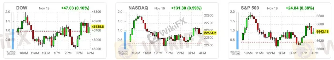 美股周三在英伟达(NVDA)财报公布前大幅震荡,开盘一度走强,但随着降息预期快速退潮、科技股波动放大,指数出现短暂回调。美国劳工统计局(BLS)宣布将 10 月就业报告并入 11 月、推迟至 12 月 16 日发布,使得美联储在 12 月会议前缺乏关键数据。联邦基金期货显示,12 月降息概率从 45% 大幅降至31%。与此同时,10 月 FOMC 会议纪要透露内部对降息方向的分歧加大,多位官员倾向暂停,也进一步压制市场风险偏好。不过,随着利空逐步被消化,盘中买盘于低位重新进场,四大指数最终反弹收高。
