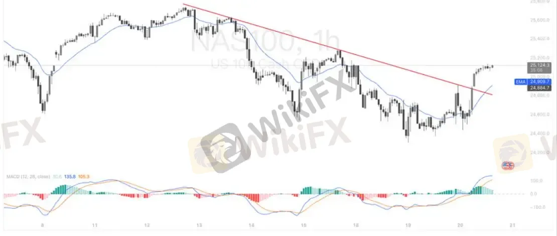 纳指在前期的连续回调后,于 19 日形成明显止跌结构,并于今日强势突破下降趋势线(红线),这是短线趋势由弱转强的关键信号。突破后价格稳稳站上 20EMA,且 EMA 已经开始上拐,显示多头主动性增强。MACD 也同步出现 零轴下的金叉 + 动能柱持续放大,典型的趋势反转形态,说明买盘开始占据优势。