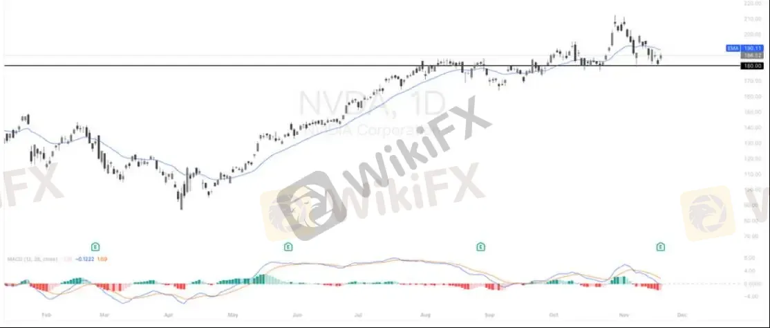 在强劲 Q3 业绩(数据中心同比 +66%,Blackwell 全线售罄、指引上调至 637–663 亿美元)推动下,Nvidia 股价在日线图成功于 180 美元关键支撑位止跌反弹,短线形成企稳形态。虽然价格仍位于 20 日均线(190 美元)下方,但近两日连续收出下影线,显示买盘在财报后明显增强。MACD 虽仍在低位,但动能柱有收敛迹象,意味着短线做空力量开始减弱。