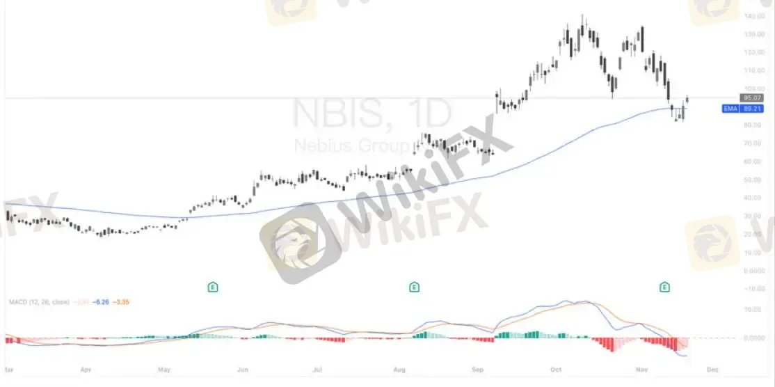 Nebius(NBIS)在本月经历约 24% 深度回调后,于 100 日 EMA(约 89 美元)获得显著支撑,昨日反弹 +5%,显示多头在结构性上升趋势中重新接手。MACD 已从极度超卖区出现初步底背离,价格成功站回 90 美元上方,短线有望进入技术性的反弹窗口。