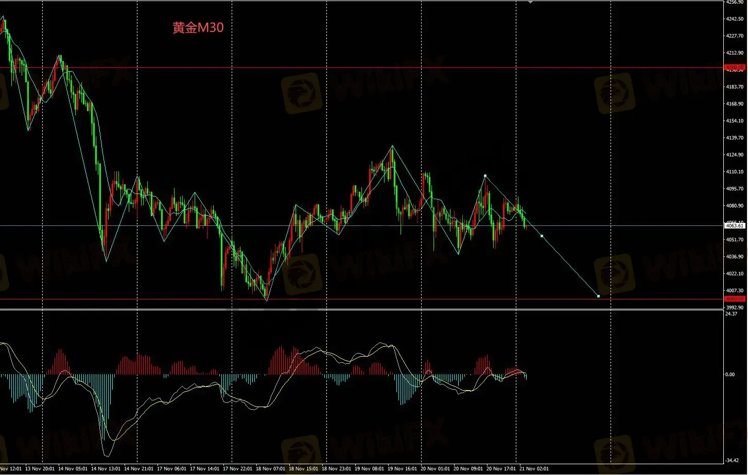 M30图表金价目前为空头走势,当前为下跌笔延续中,短期持续看空,上方压制位4100,下方目标为4000,日内若要打开进一步下跌目标必须先下破4050。