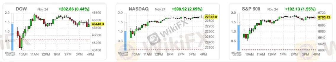 科技股成为市场反弹的主要驱动力。Google Gemini 3.0 强劲性能表现引发关注,带动 Alphabet(GOOG) 大涨 6.3%。Meta、Netflix 在估值压力缓解下同步反弹。微软涨幅相对温和,市场解读为 Gemini 的更新或将提升部分领域的竞争强度。
