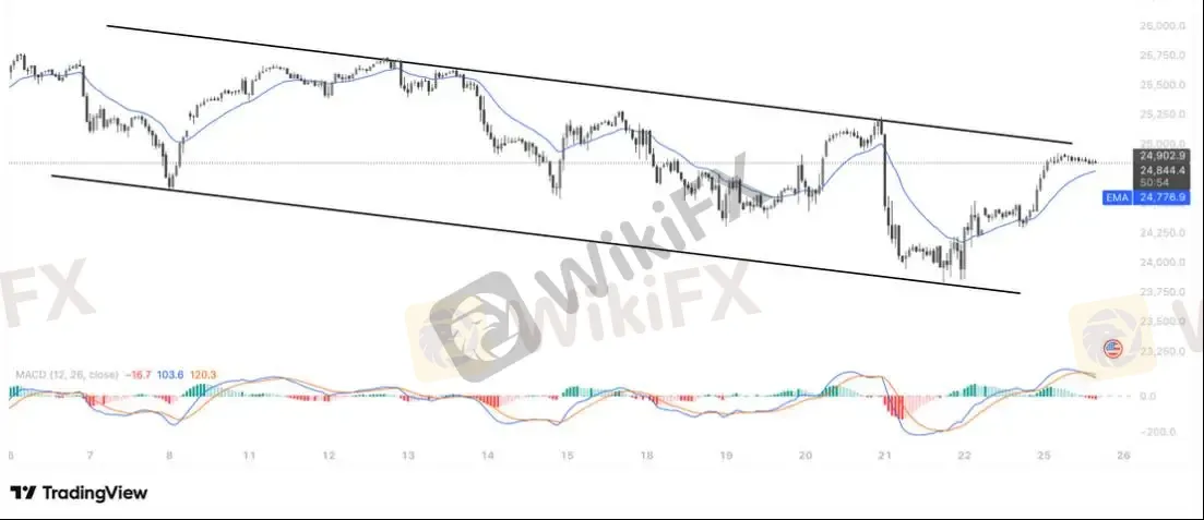 纳指短线结构偏向温和转强:价格已从通道下沿反弹并稳站 EMA20 上方,显示多头动能开始累积;目前正靠近通道上轨,虽然仍处于下降通道内,但整体节奏由“下跌—反弹”转向“筑底—测试压力”。MACD 虽有钝化迹象,但未出现明显转弱,若价格在上轨一带持续横盘并维持在 EMA20 之上,存在温和突破的潜力;整体属于 中性偏多 的格局,倾向等待确认而非提前看空。
