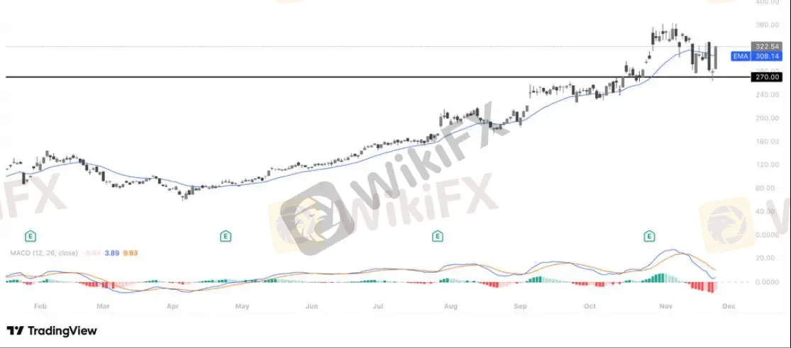CLS 在经历财报后的剧烈震荡后成功从 270 美元关键支撑位强势反弹,昨日大涨重新站回 EMA20 上方,显示多头结构并未破坏;当前股价正在重新收复失地、形成“强势回补缺口+守住前低”的组合结构,整体来看,只要 270 支撑有效,CLS 仍维持多头趋势中的正常回调后企稳格局,短线有望继续震荡上行以修复先前的快速下跌。