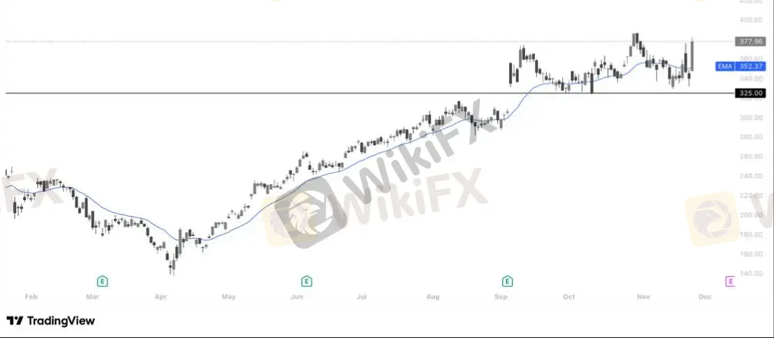 AVGO 在触及 325 美元关键支撑后强势反弹,今日长阳一举收复 EMA20 并逼近前高区,显示多头趋势结构仍牢固;过去数周的横盘震荡更像是财报前后的高位消化而非趋势反转,且 325 的支撑已经被多次验证形成中期强防线。只要股价持续稳在 EMA20 之上,AVGO 有望再度挑战 380–400 区域;若短线回落,352–340 将成为多头的首个承接区。