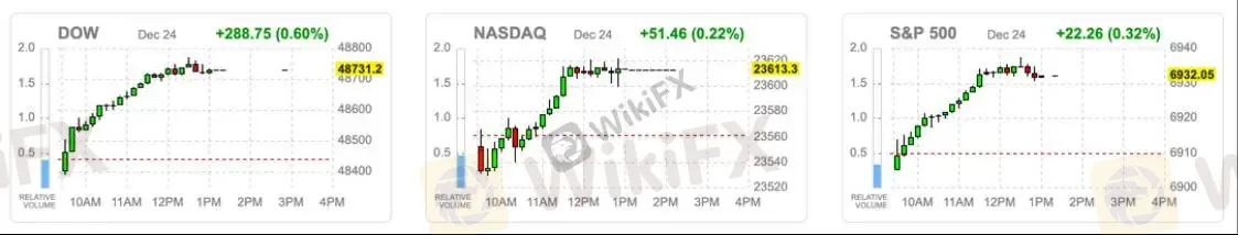 节假日前交投清淡,VIX 下探至年内低位,短周期期权与趋势型资金在低流动性环境中推动指数缓步走高;道琼斯指数收涨 0.6% 表现最佳,标普 500 与纳指分别上涨 0.3% 与 0.2%,价值股相对跑赢成长股,市场广度同步改善,近七成个股收涨。