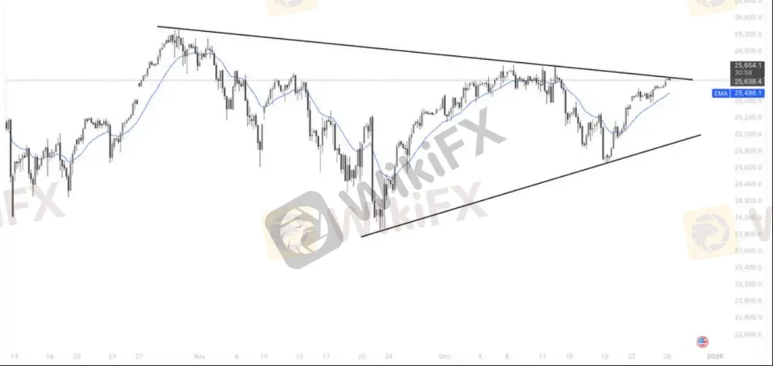 纳指100在4小时级别维持收敛三角形结构运行,价格近期回踩EMA后重新企稳并缓慢抬升,但上方仍受下降趋势线压制,短期处于典型的方向选择窗口;若有效突破趋势线并站稳25,650–25,700区域,指数有望重新进入上行趋势,反之若突破失败并跌回EMA下方,则仍将维持区间震荡,等待下一轮结构确认。