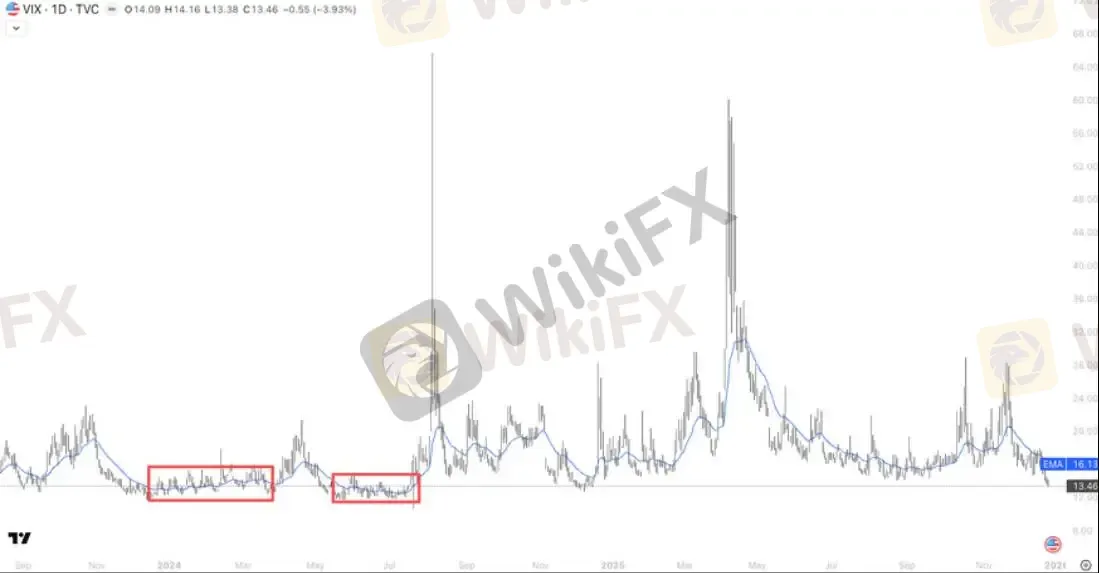 从历史走势看,VIX 在 12–15 区间长期低位震荡并非罕见,过去多次出现于风险偏好稳定、趋势行情主导的阶段,而非立即反转的信号;低波动本身更多反映的是市场对不确定性的充分定价与情绪钝化,只有当 VIX 出现快速抬升并有效脱离低位区间时,才往往对应风险资产的阶段性拐点,在此之前,低 VIX 更偏向“趋势延续而非见顶预警”。